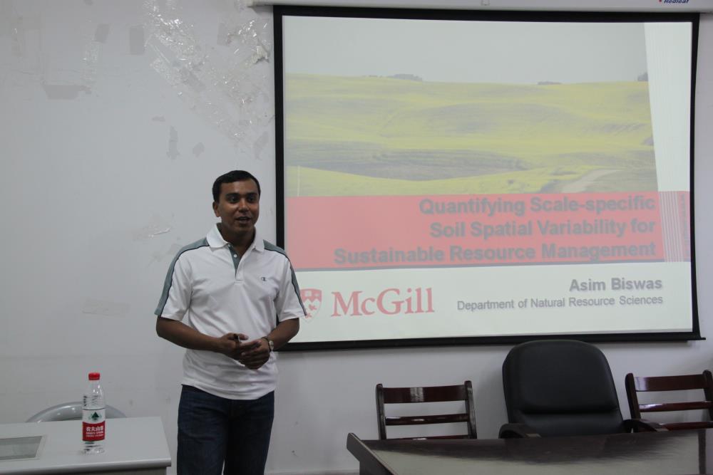 报告会上,比西瓦斯教授具体描述了土壤的含水量、N含量等特征指标随着土壤空间变化而表现出的规律性变化,通过这些规律性的特征研究,进一步应用到土壤利用精细管理中。阿西姆.比西瓦斯教授的讲解灵活生动、图文并茂,使参会师生对科学理论研究与实践应用相结合的重要性有了更加深刻的理解,开阔了研究思路,为大家提供了一个相互学习和交流的好机会。